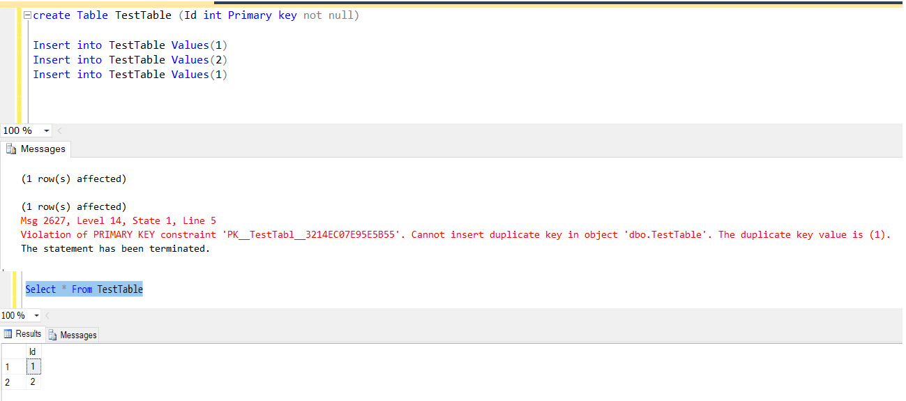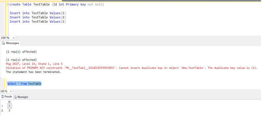 As mentioned earlier, by default XACT_ABORT is OFF by default and if there are any issue in one of transaction of a batch, the transaction alone gets failed as below: