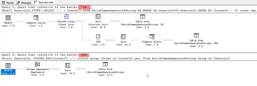 The below snapshot clearly indicates that the performance benefit of string_AGG built-in function over XML PATH approach.