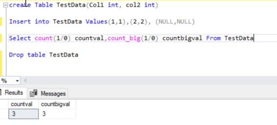 Todays post, we will quickly see the two important functions count and count_big in SQL Server. Both functions return the number of records in a table. There are lots of interesting facts with count function and we will try to cover most of things, if you have any more points, feel free to share your thoughts as a comment.