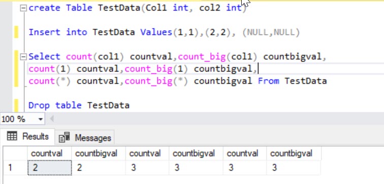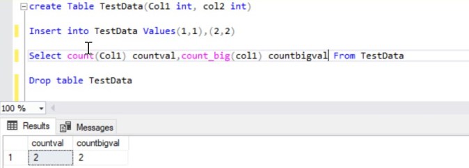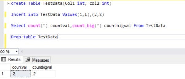 As mentioned earlier, these two functions returns the number of records, however these two differ in return datatype, COUNT_BIG always returns a bigint data type value. COUNT always returns an int data type value.