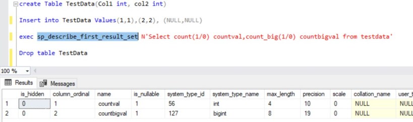 Let us quickly see with a system procedure (sp_describe_first_result_set) to understand the return datatype as below: