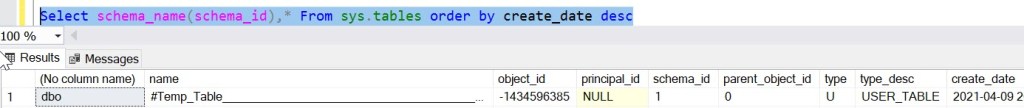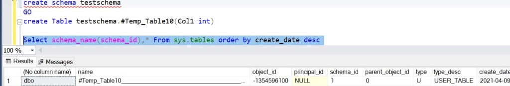 As next step, tried to create a schema and a new object is created. If you look at the schema of the object, we can clearly see that it is associated with dbo schema not the new schema. That means, the objects created in tempdb database is always creating in dbo, not in any other schema. In fact, the schema part is actually ignoring for temp tables.