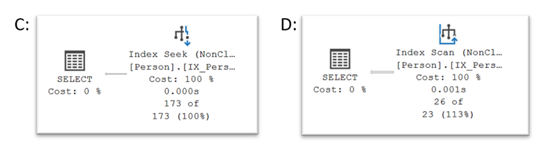 In the absence of a covering index (queries A and B), the Optimizer must choose between index seeks plus key lookups or a clustered index scan as illustrated below: