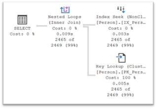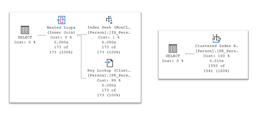 …the Optimizer first performs a seek + range scan on the nonclustered index to gather the first and last names plus the clustered index keys for all the folks named Martinez. Then, one at a time, it performs seeks into the clustered index (here referred to as key lookups) to retrieve their titles. The kicker is that each individual key lookup costs 3 logical reads, so to return 173 rows the cost is in the ballpark of 173 * 3 = 519 logical I/Os. And as the row counts increase the I/O costs increase 3X faster. As we approach 1300 rows we get to a point where it would be cheaper to simply scan the clustered index once (at a cost of ~3800 logical reads) and be done with it.