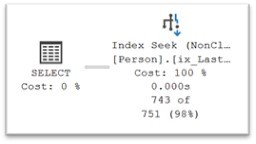 An Index Seek starts at the topmost root page then traverses any intermediate layers to get to the leaf level pages where the column data you’re after resides. The cost of each seek is the depth of the index. [Note that deeper indexes (larger tables and/or wider index keys) will have a higher seek costs.] Once we get to the leaf level, we might scan additional pages laterally to return a range of data (e.g., all the persons whose last name is Martinez).