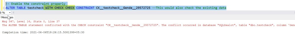 We can see that the CHECK CONSTRAINT operation is enabling the constraint and it violates the next insert statement as expected. However, if you notice the existing data, there is a violated data, which is not evaluated. Quite interesting, right? So, we need a different way to enable the constraint that also verifies the existing data. Here we go with the usage of WITH CHECK.
