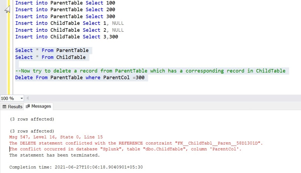 First off, let us try to insert some data in both tables and try to delete from Parent which has reference record in ChildTable.