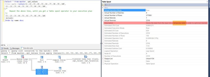 In the below snapshot, we can observe that the spool operator stores the data from the input, here its nothing but constant scan into a temporary tables to avoid multiple rewinds.