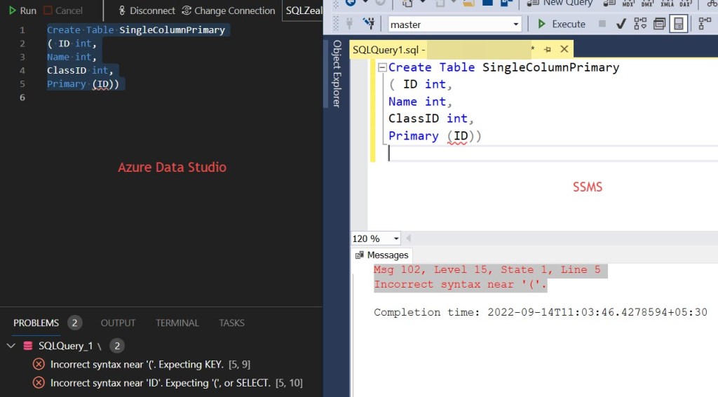 The below screenshot is a comparison between ADS and SSMS and it is clearly visible, while you write the code itself, ADS “Problem” section provided information that there is a KEY word missing in the 5th row and 9th column.