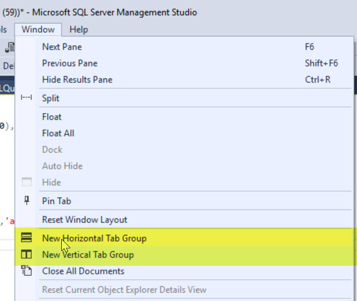 Select Window Menu in SSMS – > Select “New Horizontal Tab Group” OR “New Vertical Tab Group” as you wish to see the query windows either horizontally or vertically!